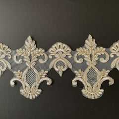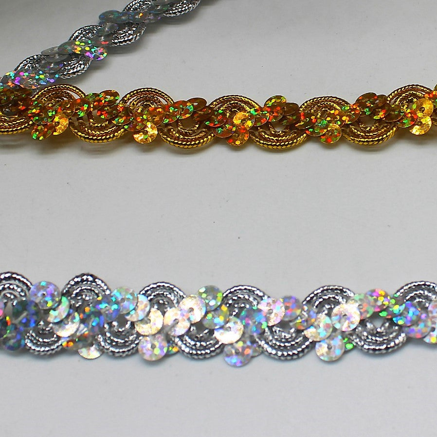 A silver sequinned trim in a wave design . The silver laser hologram sequins reflect blues and greens.  A soft flexible trim.  Also available in gold (Product Number TG1011).